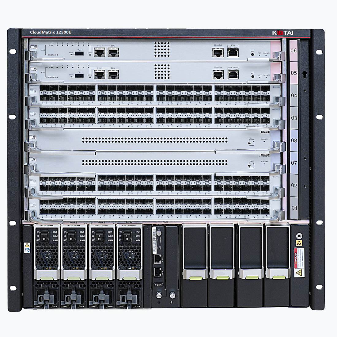 CloudMatrix12500E现提供CM12500E-4和CM12500E-8两种机型,分别支持4/8个业务板插槽。